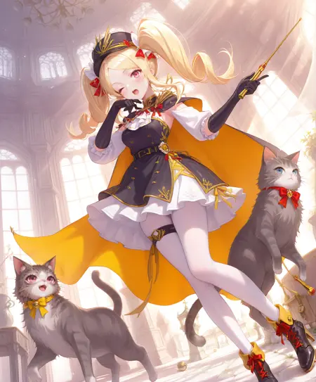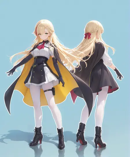 hat,black gloves,[elbow gloves,] belt,[yellow and black] cape,black dress,white/black skirt,[white shirt/sleeveless,] white/black pantyhose,thigh strap, boots,