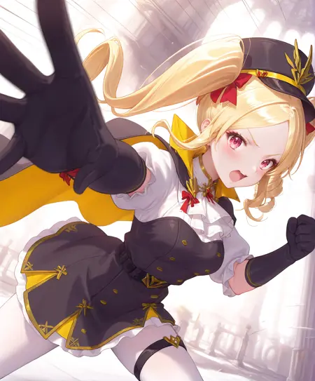 Opulent Strategist(shaodwverse),pink eyes,blonde hair,[parted bangs,] drill twintails, long hair,[hair ornament,]