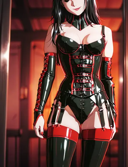 gothicmistressl1, gothic style, 1girl, pale skin, latex, latex outfit, neck corset, garter belt, red lips, black hair