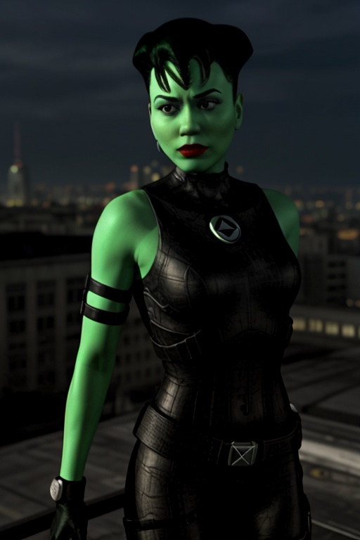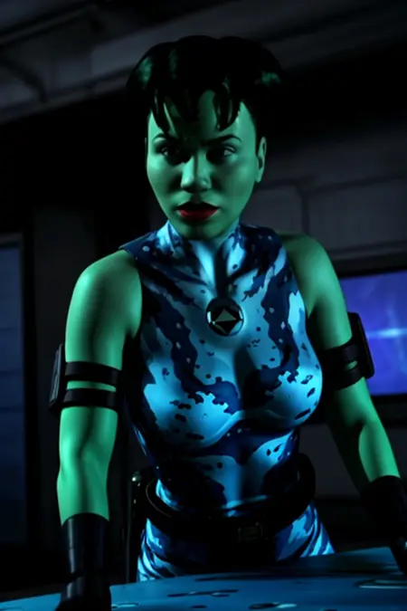 그녀의 캐모플라주와 가죽 옷을 지정할 수 있습니다. 원래 옷도 어딘가에 있지만, 녹색 피부와 복숭아색 피부에 단단히 맞는 옷을 학습시키는 것은 SD를 완전히 혼란스럽게 만듭니다.