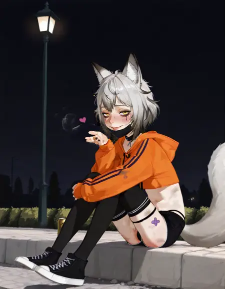 KitsuraNines, 1girl, animal ears, fox ears, tail, shorts, black thighhighs, virtual youtuber, black shorts, exposed thong, orange cropped hoodie, hood, animal slippers, grey hair, heart thigh strap, animal ear fluff, sleeves past wrists, collar, purple bandaids,