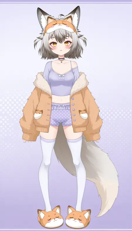 KitsuraNinesJammies, 1girl, animal ears, grey hair, multicolored hair, colored tips, yellow eyes, fox ears, tail, shorts, white thighhighs, virtual youtuber, animal slippers, animal ear fluff, sleeves past wrists, jacket with lavender colored buttons, off shoulder, crop top, blush, choker, black eyeliner, sleep mask,