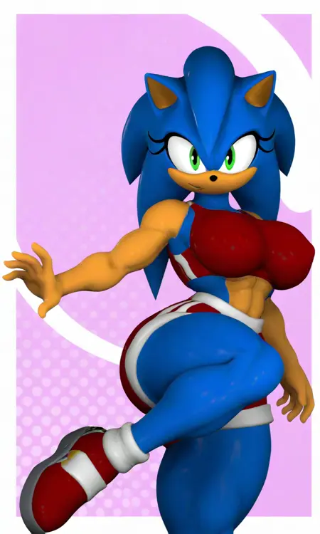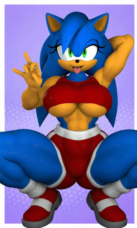 标签:km_soniko, 刺猬, 蓝色毛发, 绿色眼睛, 红色短上衣, 红白短裤, 红色鞋子, 五指