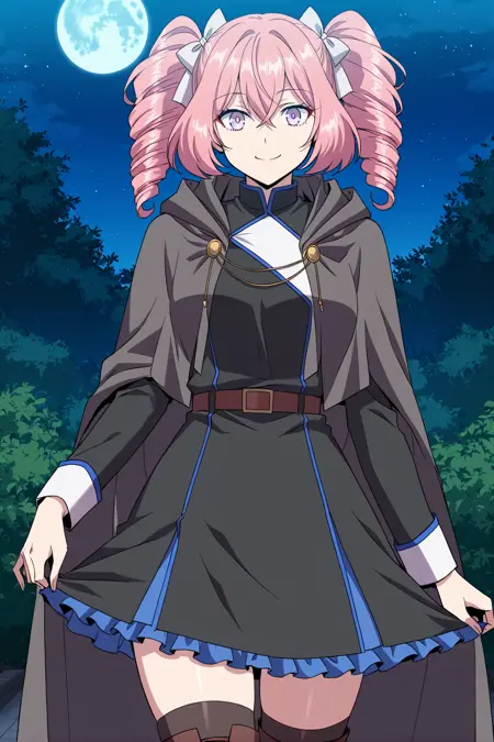 Lincy_outfit, black cloak, gold button, black dress, white dress detail, high collar, blue trim, black skirt, blue hem frills, black thighhighs, brown boots