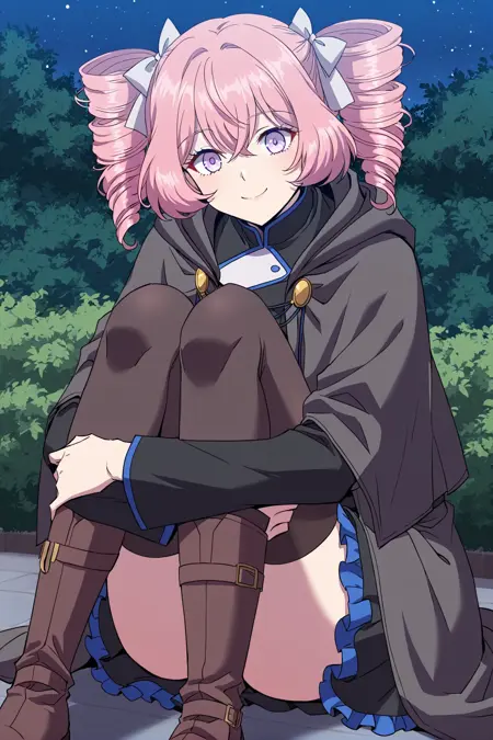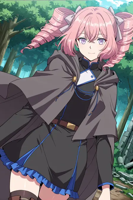 Lincy, 1girl, solo, light purple eyes, pink hair, medium hair, uneven bangs, hair between eyes, curled hair, twin drills, white hair bow,