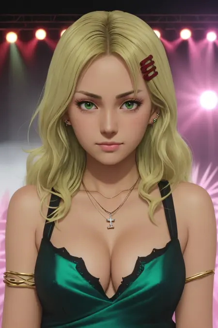 Prompt activator: mikotoaiura, blonde hair, green eyes, dark skin, cleavage, hairclip, school uniform