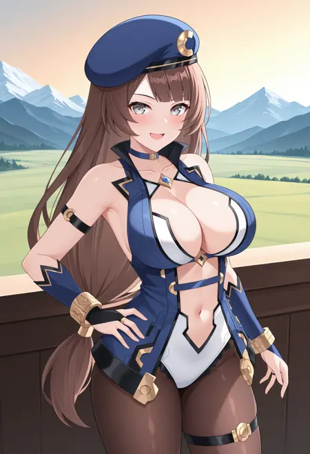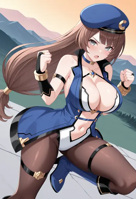 cshadef, ベレー帽, 青いベスト, 青いドレス, 短いドレス, 開いたドレス, 白いレオタード, 白いブラ, 黒いトリム, 中央開口部, 青いチョーカー, 鎖骨, 肩の露出, 胸元の露出, おへそ, ジュエリー, ブレスレット, 腕ストラップ, ブライダルグローブ, パンティーホース, 太ももストラップ, 交差ストラップ, 膝上ブーツ, 青い靴, ブーツ, ハイヒール,