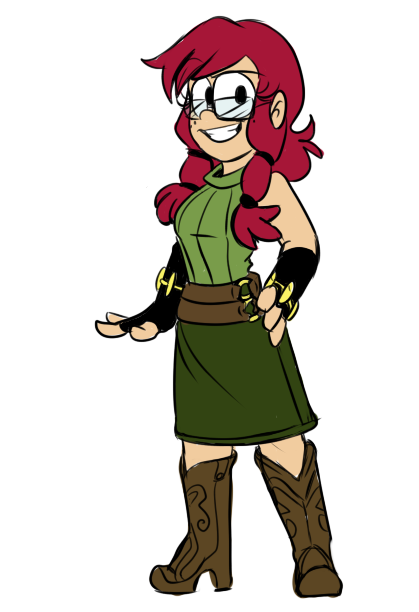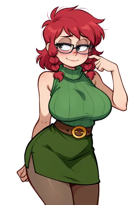 服装1:无袖高领衫,绿色毛衣,腰带,绿色短裙,连裤袜,靴子