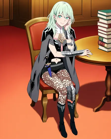 | 训练词汇 | byleth_fire_emblem, medium hair, 1girl, solo, long hair, blue eyes, hair between eyes, blue hair 已复制! navel, short sleeves, pantyhose, belt, midriff, black footwear, armor, coat, high heels, clothing cutout, short shorts, detached collar, capelet, turtleneck, black shorts, floral print, knee boots, tassel, shoulder armor, sheath, lace trim, cloak, armlet, high heel boots, brown pantyhose, sheathed, black cape, vambraces, dagger, navel cutout, knee pads, pantyhose under shorts, lace-trimmed legwear, waist cape, print pantyhose, elbow pads, bustier, teacher, black armor, patterned clothing, bodice, single knee pad 已复制! |