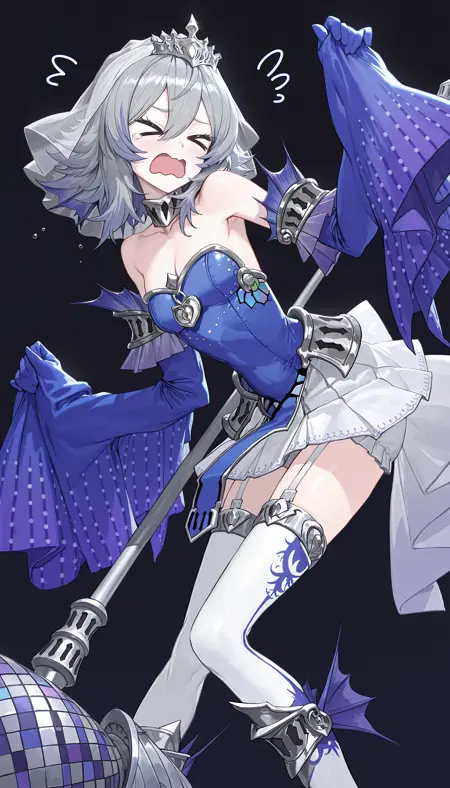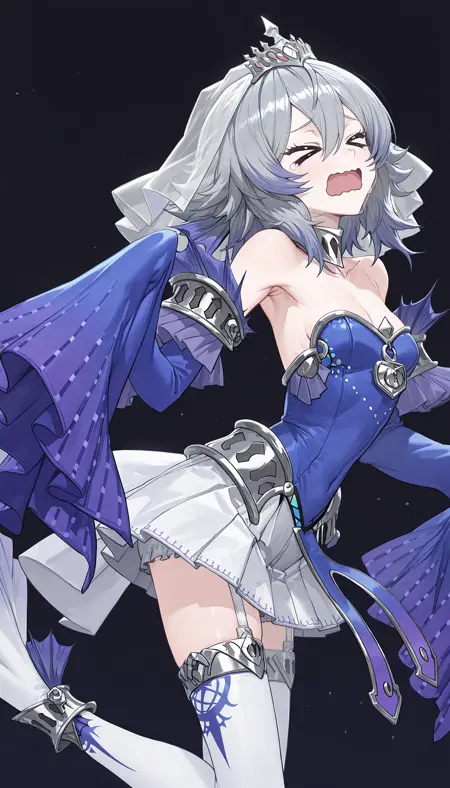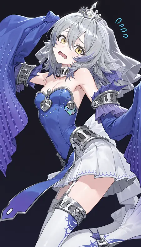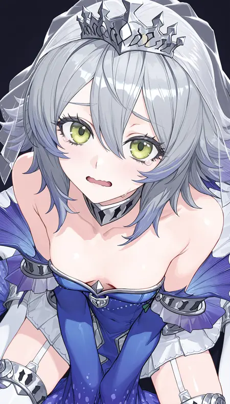 grey hair,short hair,multicolored hair,blue_see-through veil, silver tiara,