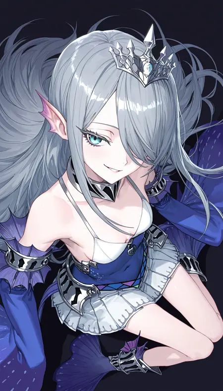 aqua eyes, grey hair, hair over one eye, pointy_ears, silver tiara,