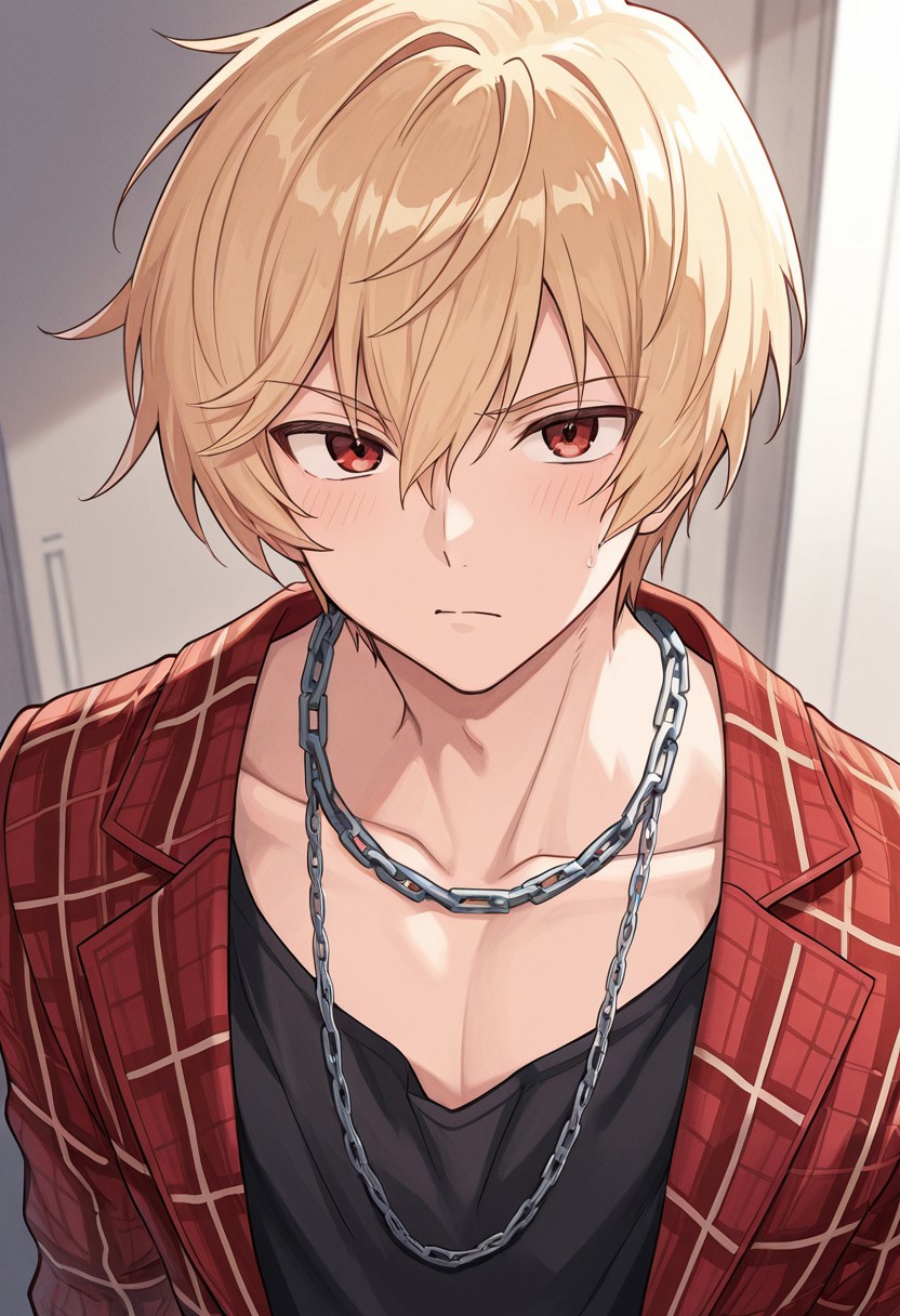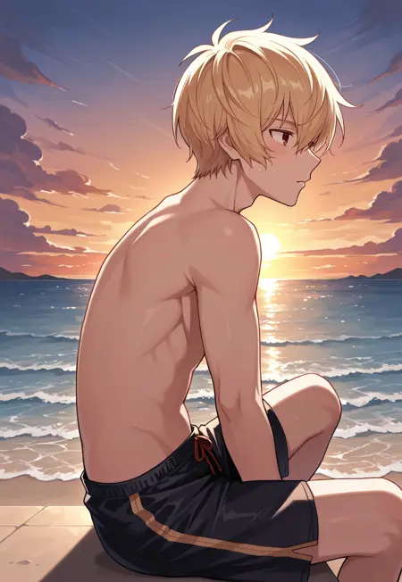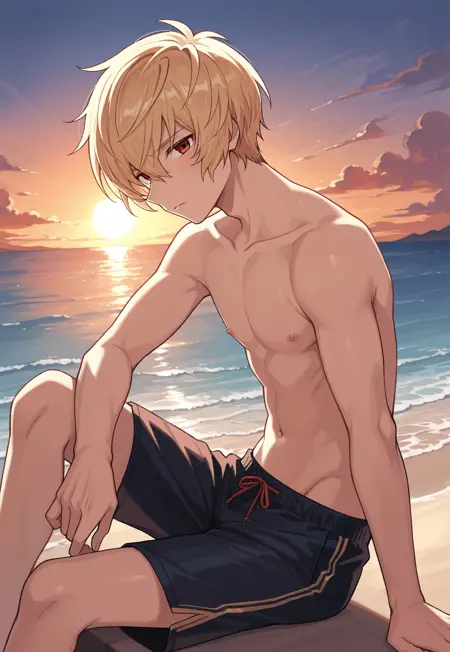 1boy, male focus, red eyes, blonde hair, white shirt, open shirt, black gloves, fingerless gloves, black shorts, clothes around waist, belt, sandals,