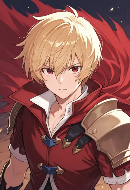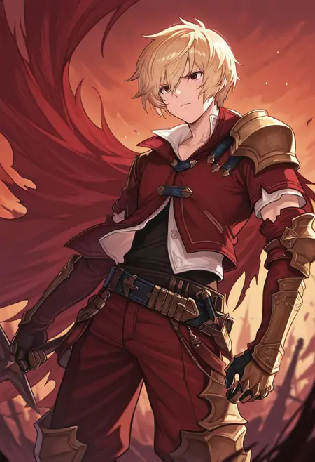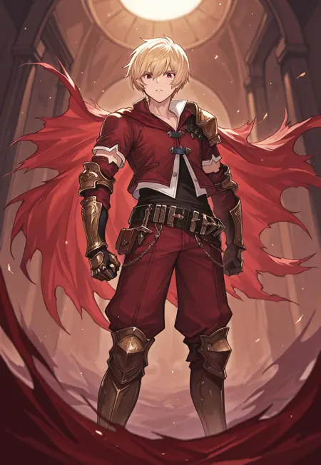 1boy, male focus, solo, red eyes, blonde hair, white shirt, red jacket, red cape, torn cape, shoulder armor, gauntlets, belt, red pants, armored boots,