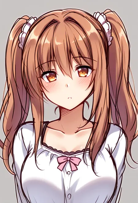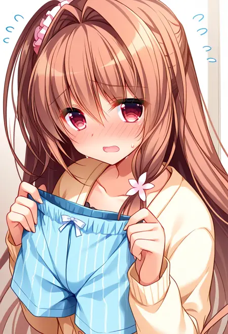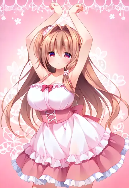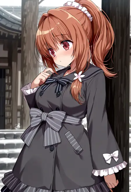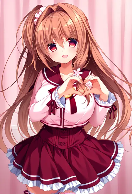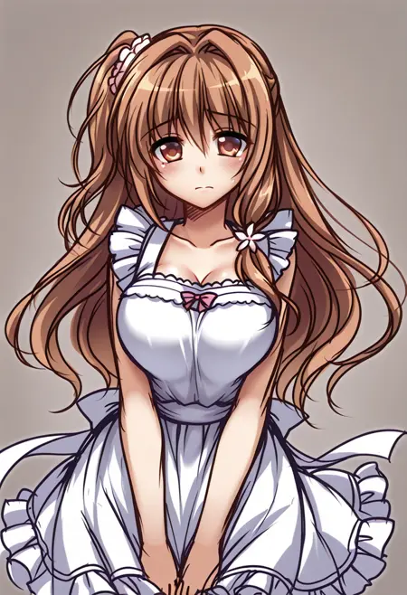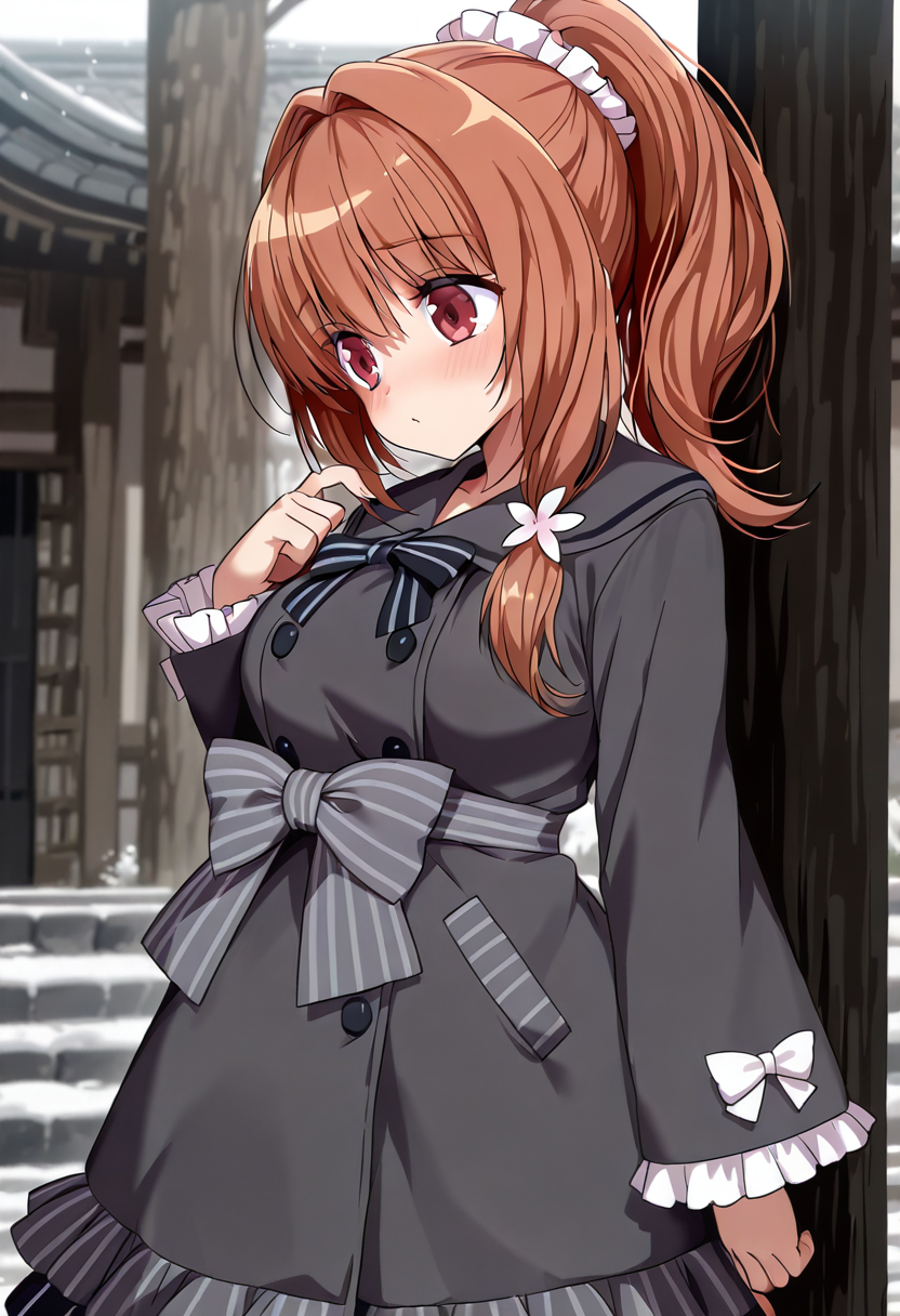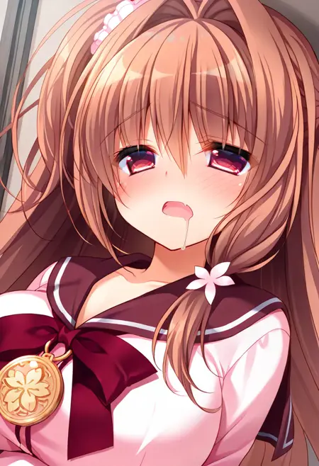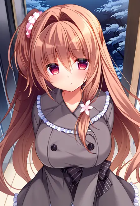触发词: unazuki shizuri, 1girl, 棕色头发, 长发, 一侧束起, 发丝飘动, 头饰, 发饰花, 红眼, 大胸部