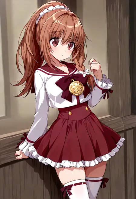 校服: shizuuniform, 长袖, 高腰裙, 红色裙子, 金色吊坠, 花边, 过膝袜