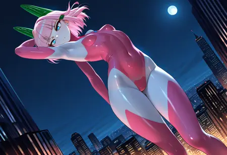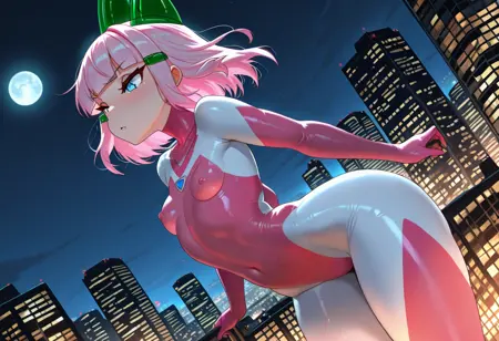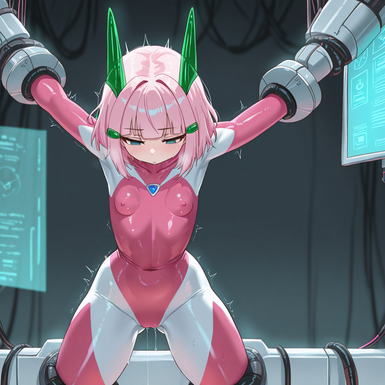 prompt:1girl, (solo), bangs,white skin, blue eyes, pink hair, green horns, (pink bodysuit), slender body, small breast