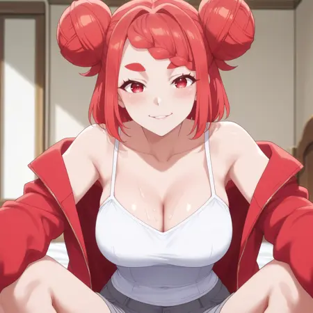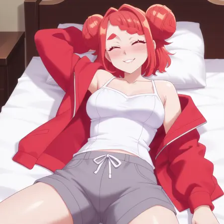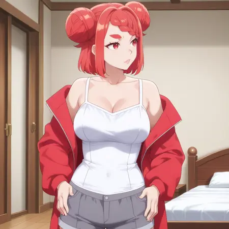 MonicaSleep,白色吊带,锁骨,灰色短裤,露肩,红色夹克,敞开衣物,
