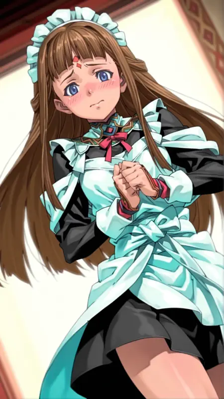 외모: 긴 머리, 갈색 머리, 곧은 앞머리, 파란 눈, 이마에 문양,