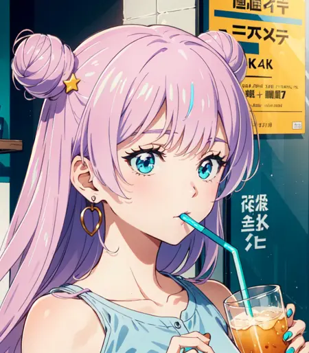 Akari Watanabe, 1girl, skirt, solo, pink hair, long hair, breasts, green eyes, hair bun, cleavage, earrings, necklace double bun