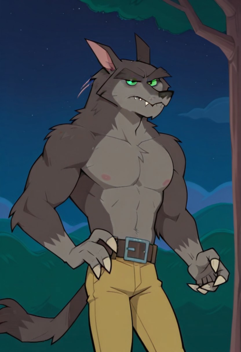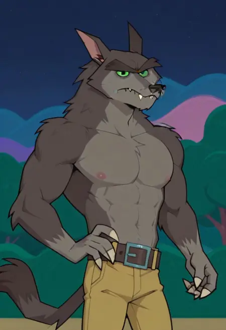 werewolf-TDMRM, grey-brown fur, greyish underbelly, thick eyebrows, green eyes, big belt, torn yellow pants, claws, tail