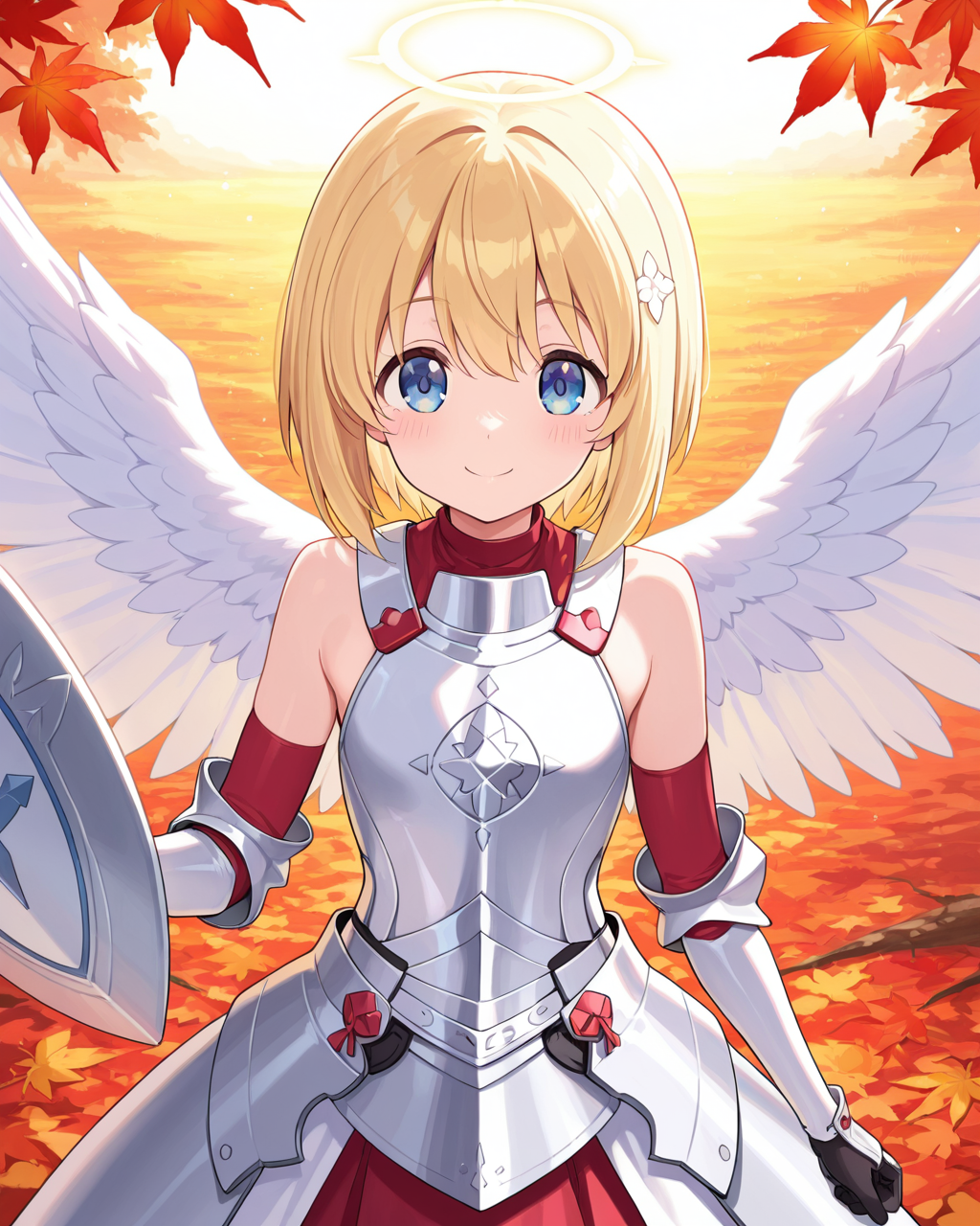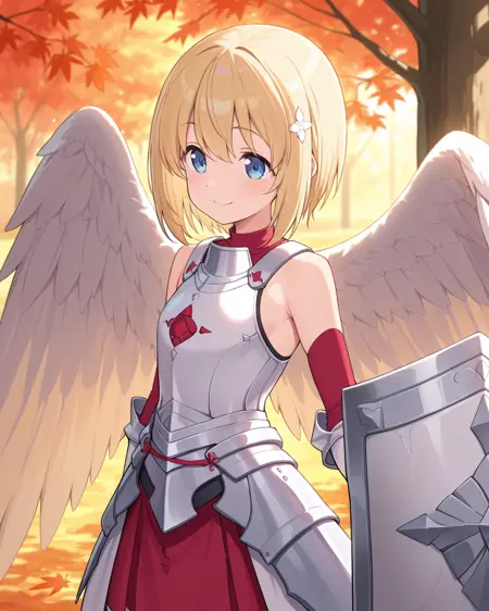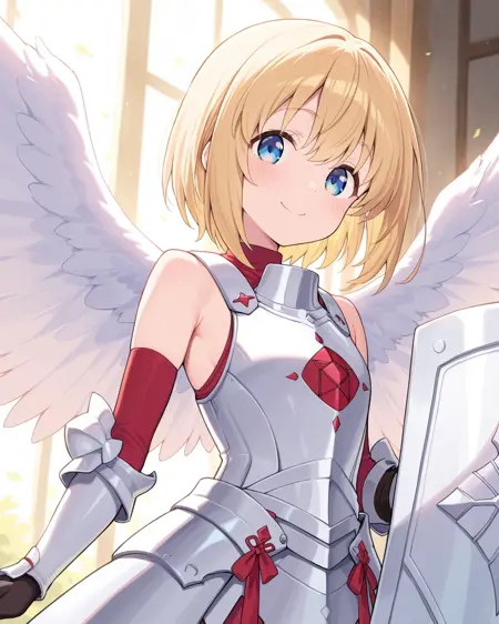 花井楓、メイプル、金髪、青い目、ショートヘア、1人-girl、ソロ、翼、笑顔、白い盾、白い鎧、手袋、天使の翼、装甲ドレス、スカート、肘までの手袋