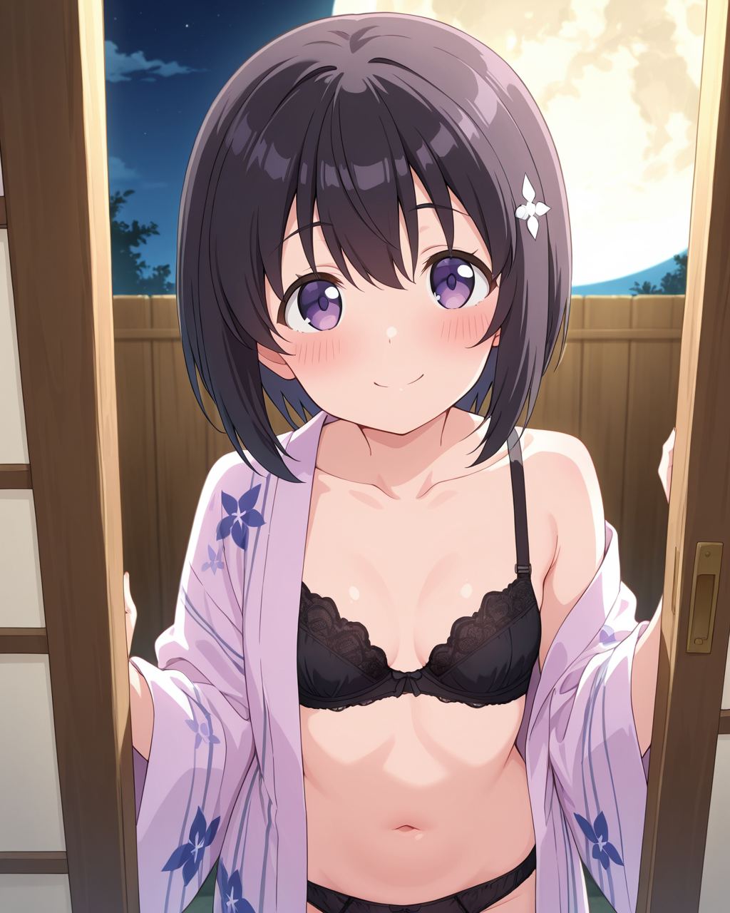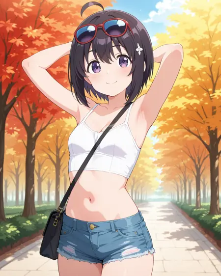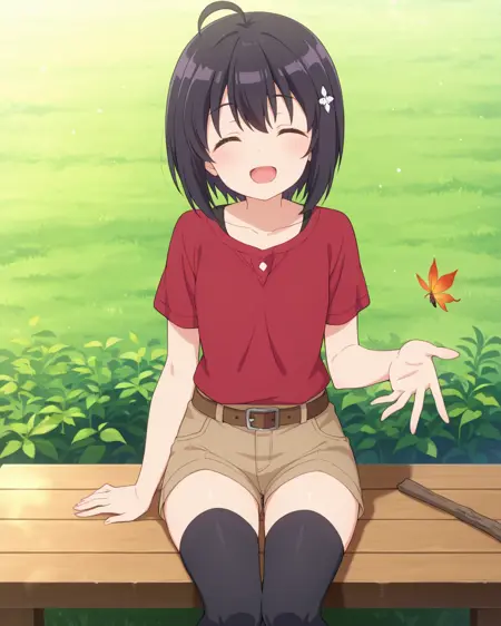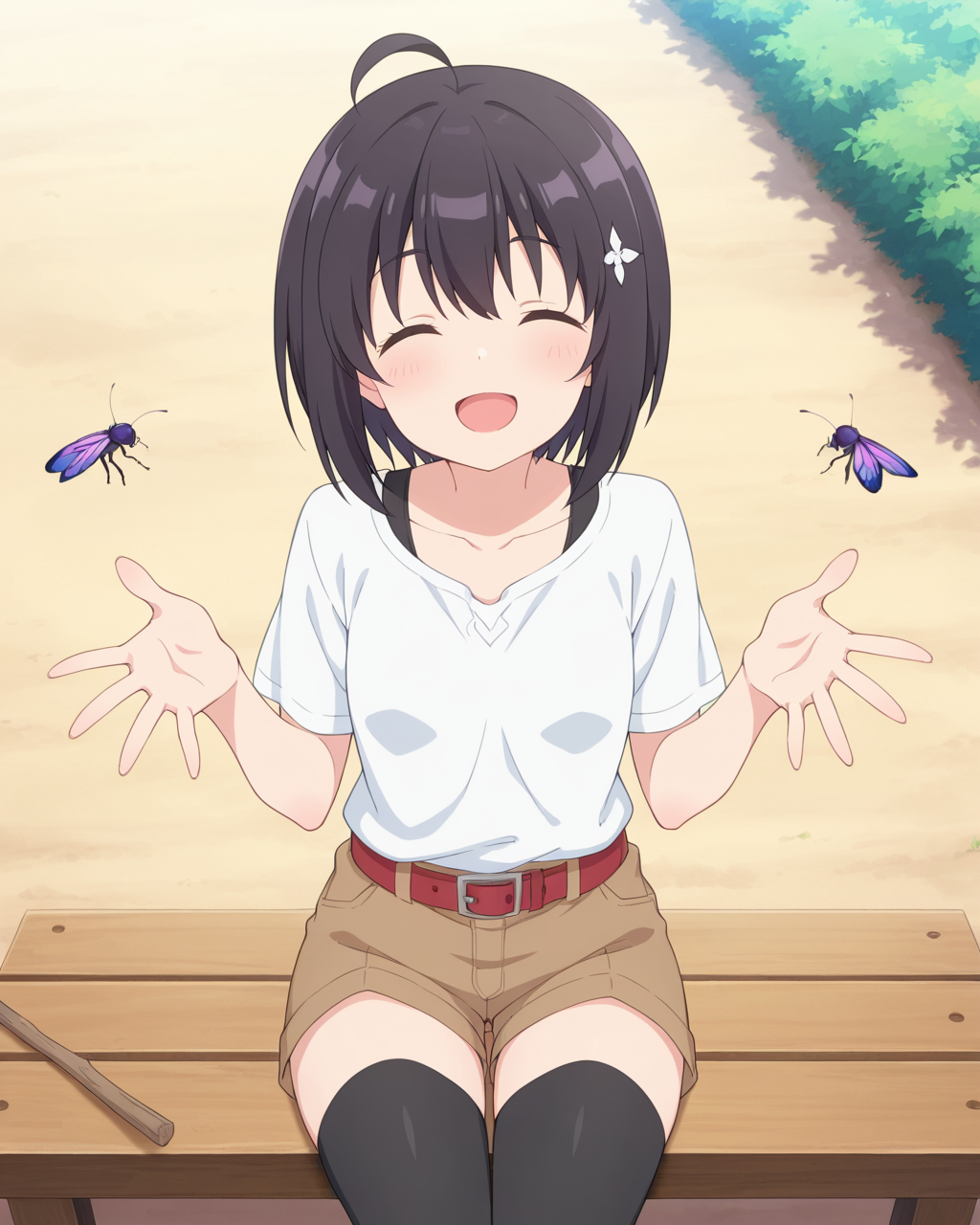 花井楓、メイプル、黒髪、紫の目、ショートヘア、1人-girl、目を閉じた、タイツ、ショートパンツ、開いた口、笑顔、アホ毛、髪飾り、座っている、ショートヘア、黒いタイツ、ベルト、観客に向いている、:d、持ち物、シャツ、鎖骨、茶色のショートパンツ、短い袖、髪止め、屋外、棒、^\_^、虫、手を伸ばしている