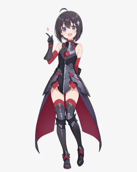花井楓、メイプル、黒髪、紫の目、ショートヘア、1人-girl、ソロ、黒い鎧、鎧、手袋、笑顔、開いた口、裸の肩、ブーツ、黒い手袋、髪飾り、持ち物、:d、観客を見つめる、黒い靴、アホ毛、装甲ブーツ、眉間の髪、タイツ、赤い袖、人差し指を上げる、赤い手袋、肘までの手袋、全身