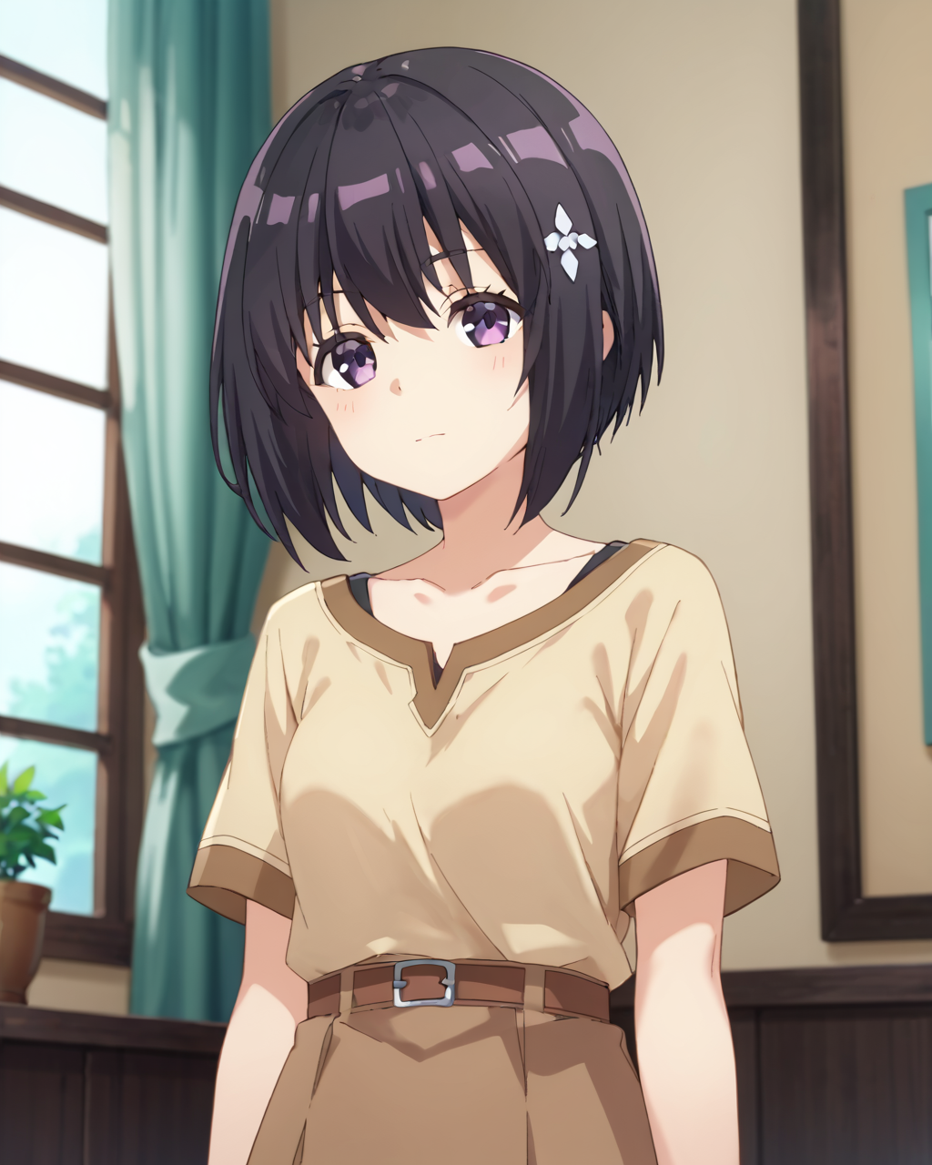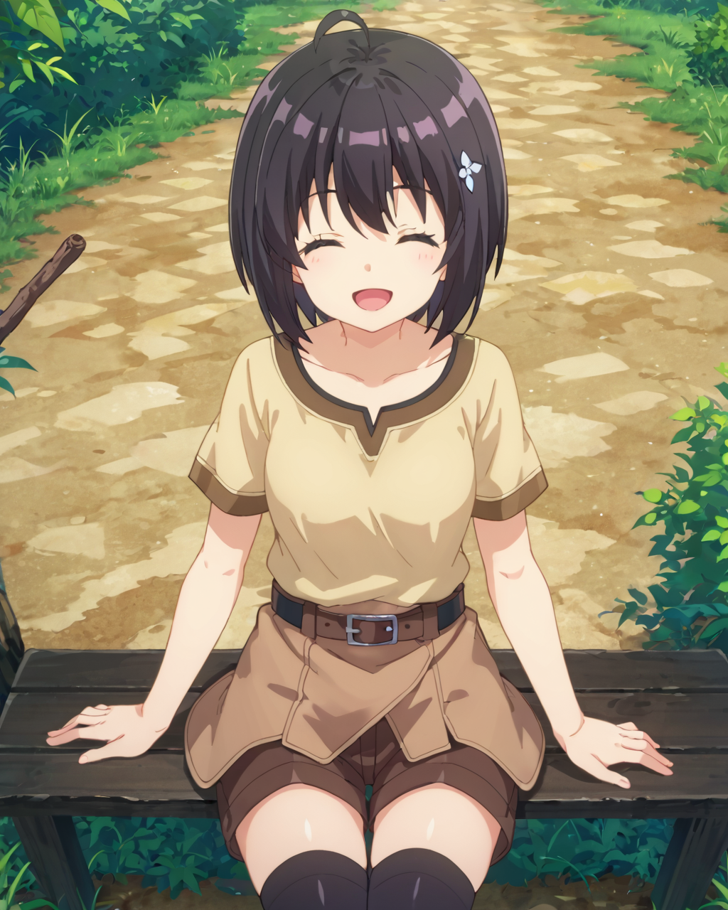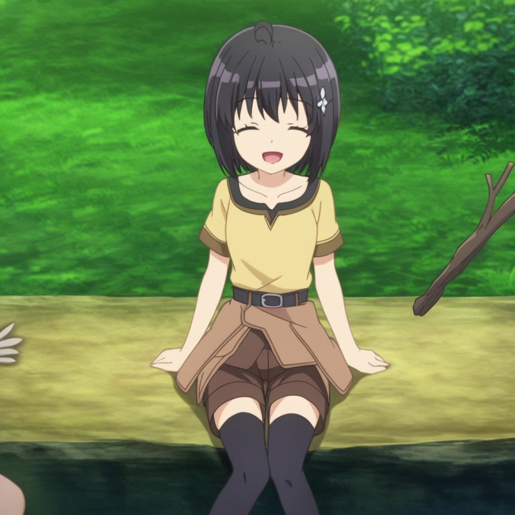 • Kaede Honjou, Maple, Black hair, Violet eyes, short hair, 1girl, closed eyes, thighhighs, shorts, open mouth, smile, ahoge, hair ornament, sitting, short hair, black thighhighs, belt, facing viewer, :d, holding, shirt, collarbone, brown shorts, short sleeves, hairclip, outdoors, stick, ^_^, bug, outstretched hand