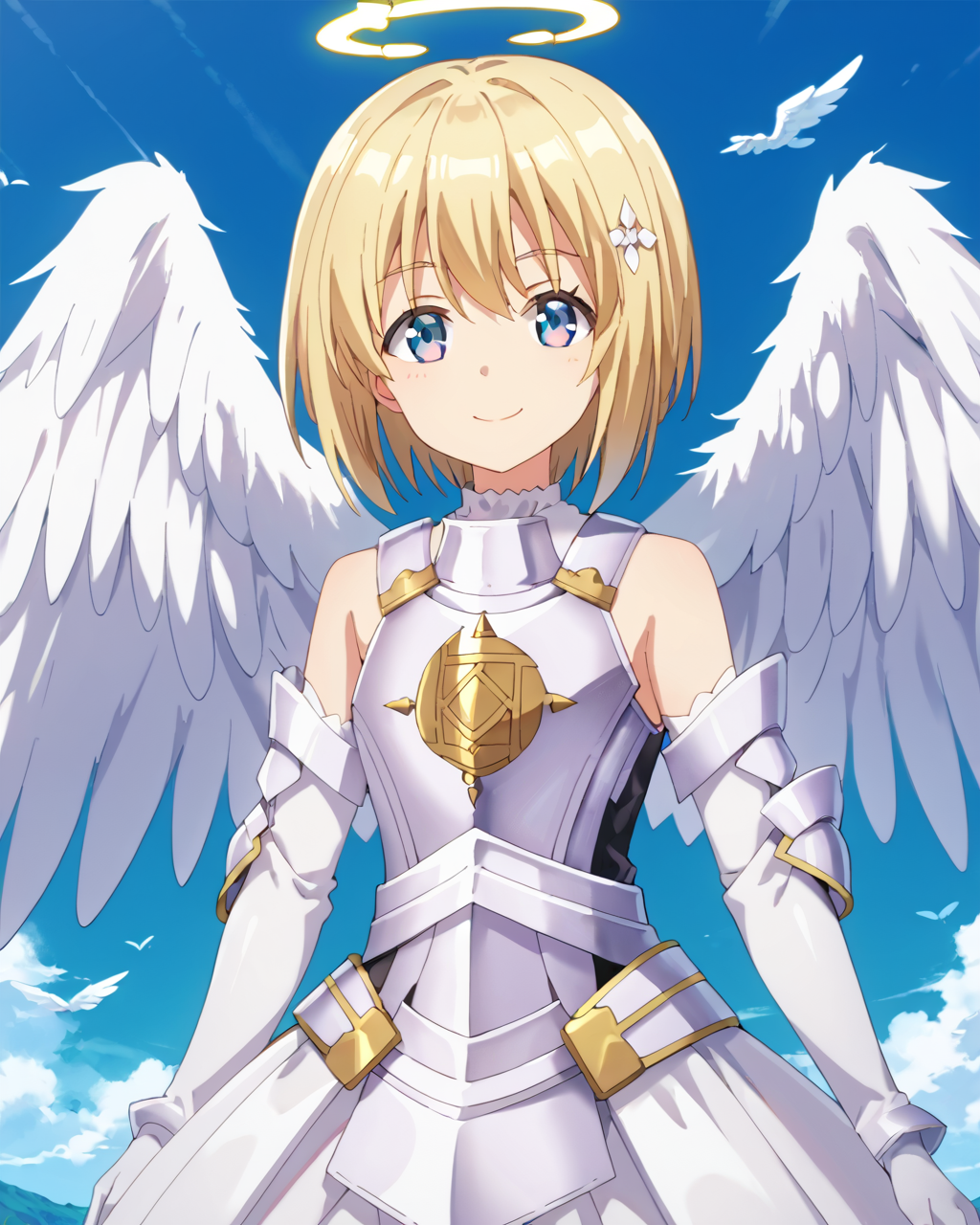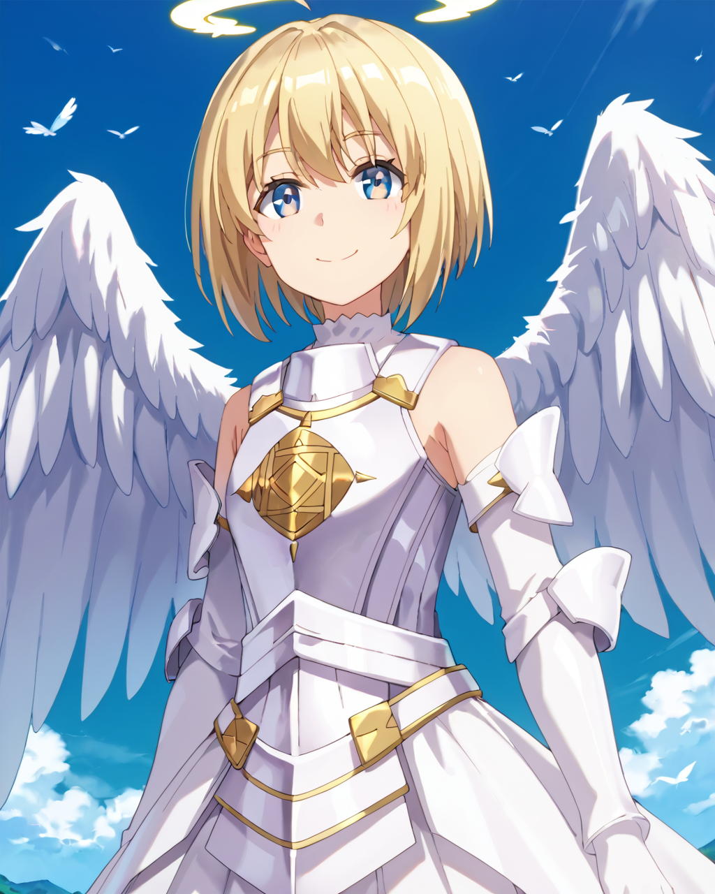 • Kaede Honjou, Maple, blonde hair, blue eyes, short hair, 1girl, solo, wings, smile, white shield, white armor, gloves, angel wings, armored dress, skirt, elbow gloves
