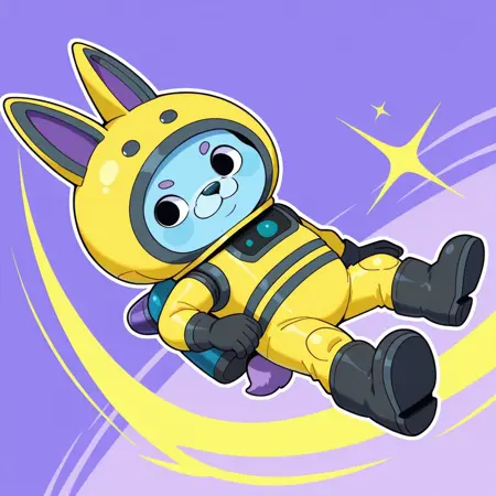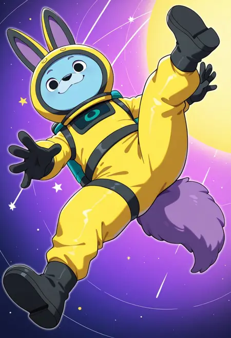 solo, male, anthro otter, yellow spacesuit, black gloves, black boots, rabbit-like ears on hood, blue jetpack, blue face, smoky-looking purple short tail, purple fluffy tail, black eyes, white muzzle, black nose