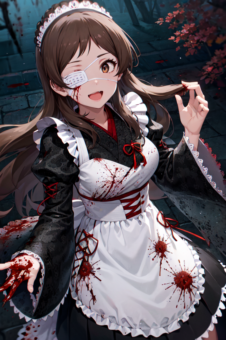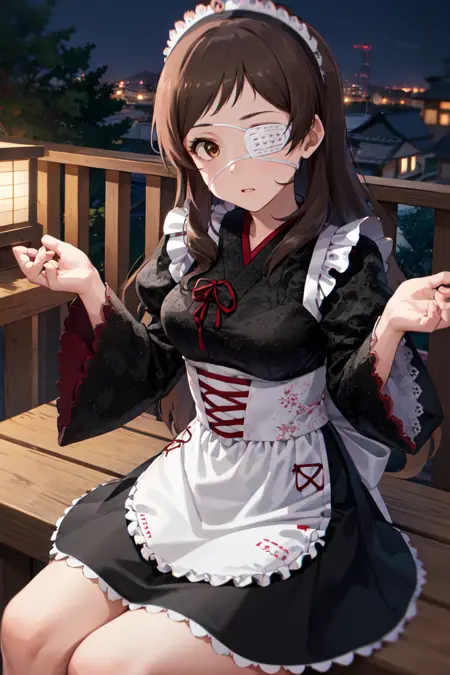 "KitazawaEyepatch, eyepatch, wa maid, maid headdress, maid apron, japanese clothes"