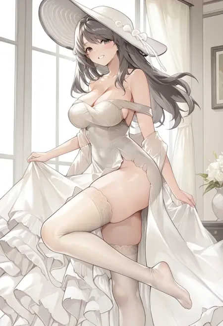 china dress,cleavage, lace-trimmed legwear, feather boa,