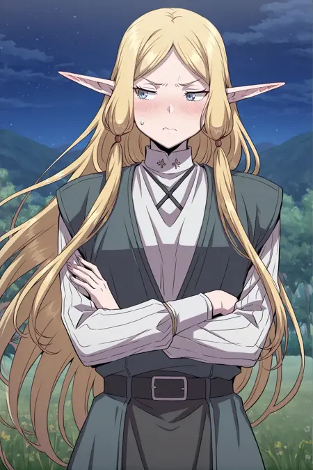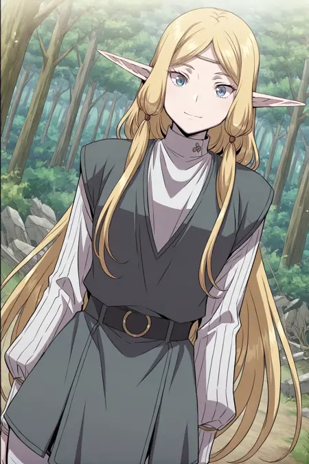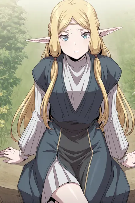 huibi, 1girl, solo, elf, elf ears, blue eyes, blonde hair, long hair, long bangs, parted bangs, long sidelocks, tied sidelocks,