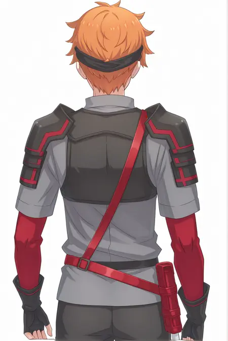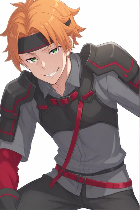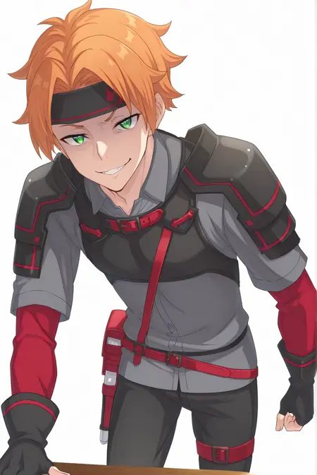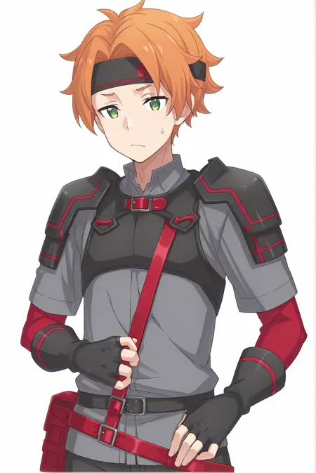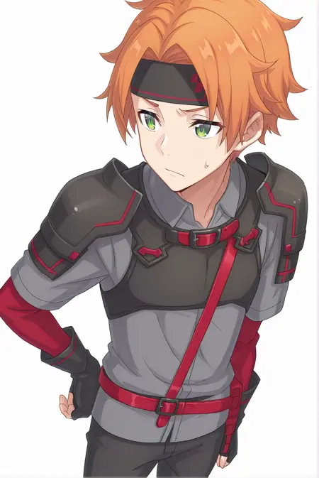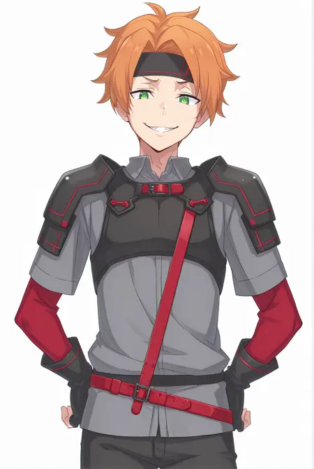 ToddFang-Liver020, 1boy, solo, 1 man, male focus, orange hair, short hair, green eyes, bangs, black headband, headband, grey shirt, collared shirt, short sleeves, red long sleeves, black fingerless gloves, ornaments, body harness, shoulder armor, pauldrons, black pants, red belt, red strap, sode,