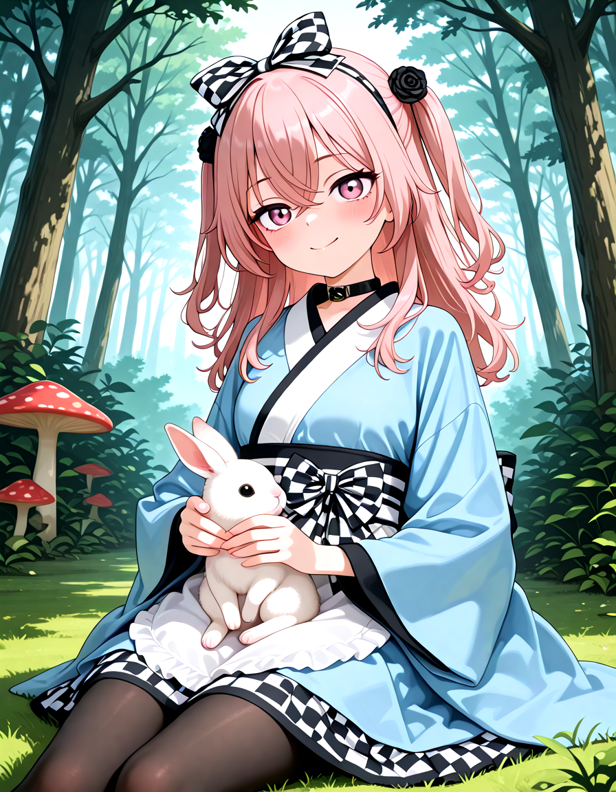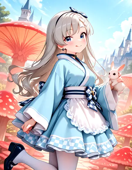 Alice_Cos_Kimono, 长袖, 格子裙, 角色扮演, 蓝色连衣裙, 蝴蝶结, 日本服饰, 蓝色和服, 格子蝴蝶结, 袖子超过手腕, 腰带, 宽袖, 项圈, 腰围围裙, 连裤袜, 格子连衣裙, 领子, 背部蝴蝶结