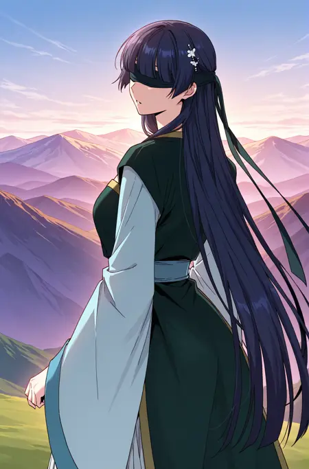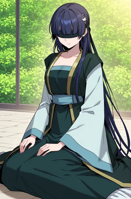 마리아, 1소녀, 솔로, 진한 파란색 머리카락, 긴 머리카락, 곧은 머리카락, 곧은 앞머리, 눈 위의 머리카락, 옆머리, 머리장식, 흰색 머리핀, 꽃무늬 머리핀, 눈가리개, 검은 눈가리개,