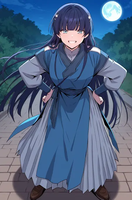마리아_아웃핏2, 파란색 겉옷, 짧은 소매, 파란색 허리띠, 회색 안티셔츠, 긴 소매, 파란색 팔목, 파란색 겉스커트, 옆슬릿, 흰색 안쪽 스커트, 긴 스커트, 갈색 구두,