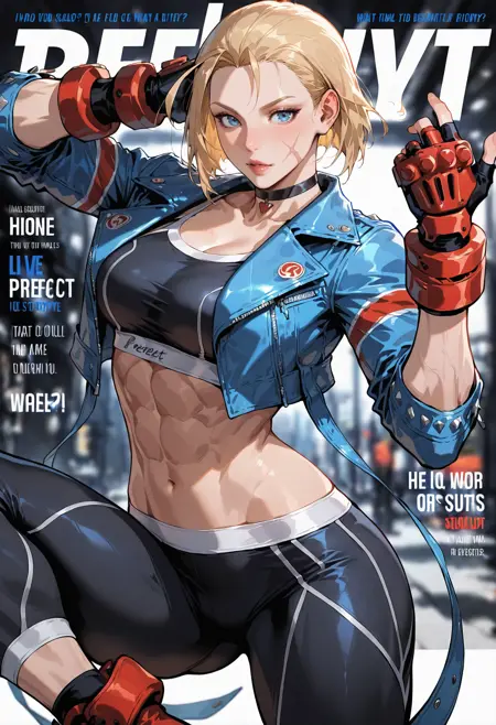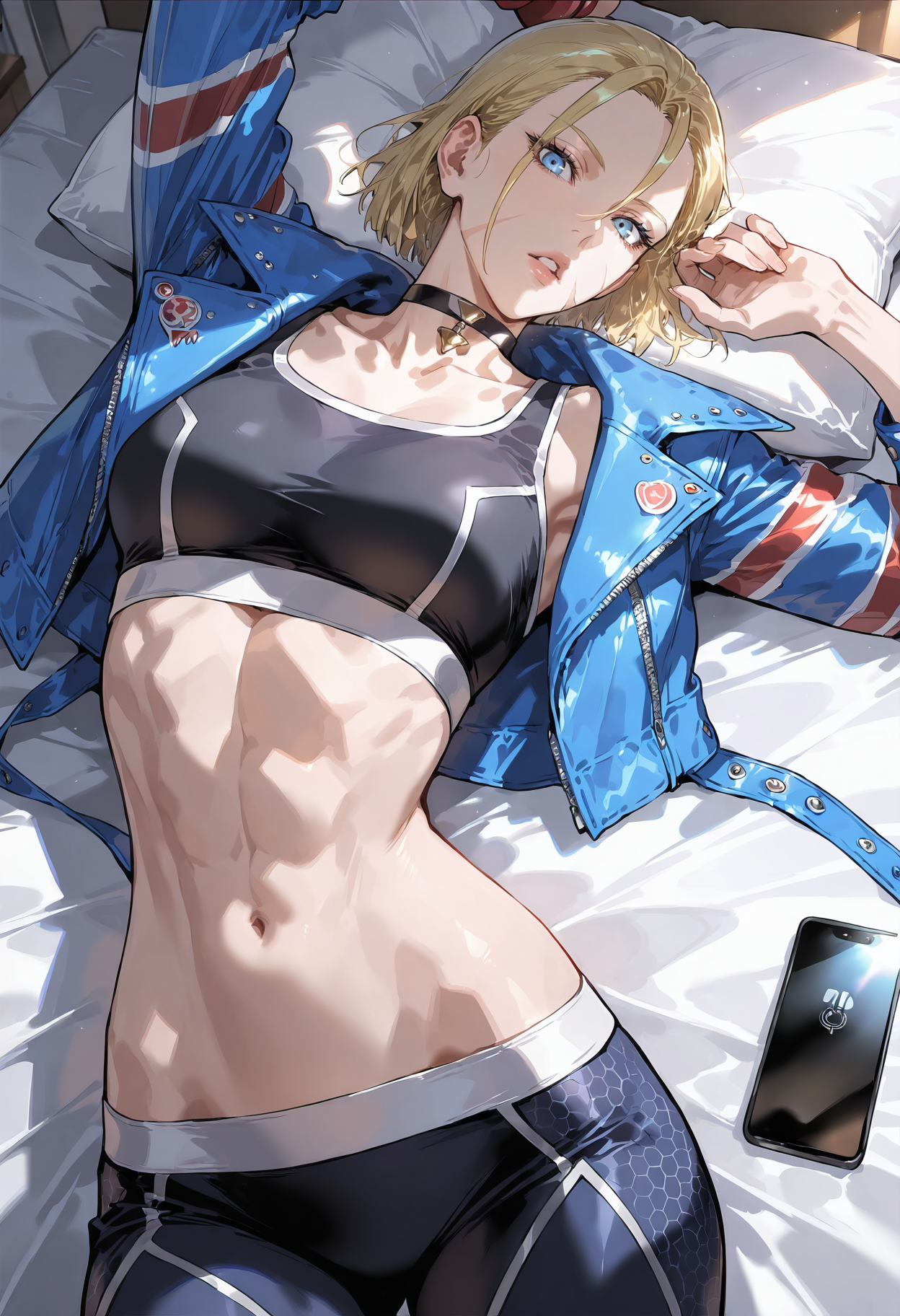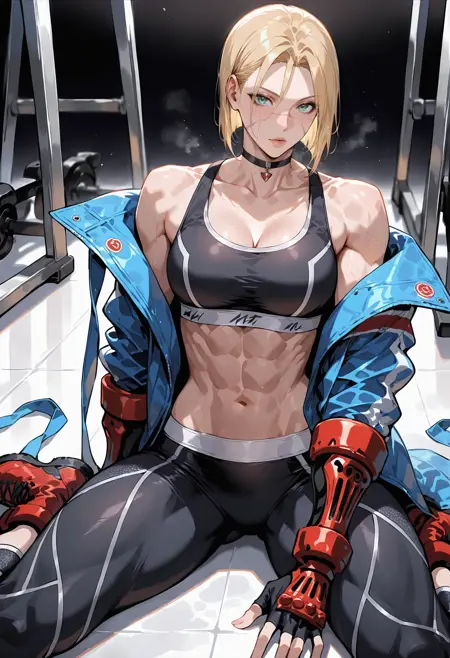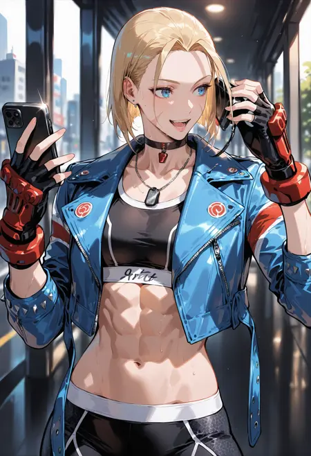SF VI 衣装: 1girl,scar,blonde hair,jacket,gloves,cropped jacket,scar on face,sports bra,leather,abs,choker,scar on cheek,antenna hair,fingerless gloves,pants,leather jacket,midriff,boots,red gloves,blue jacket,alternate costume,red footwear,open jacket,crop top,black sports bra,short hair,ankle boots,tight pants,blue eyes,toned,denim jacket,black pants,tight,alternate hairstyle,muscular,open clothes,combat boots,socks,scar on nose,yoga pants,scar across eye,breasts,shoes,ahoge,sneakers,black choker