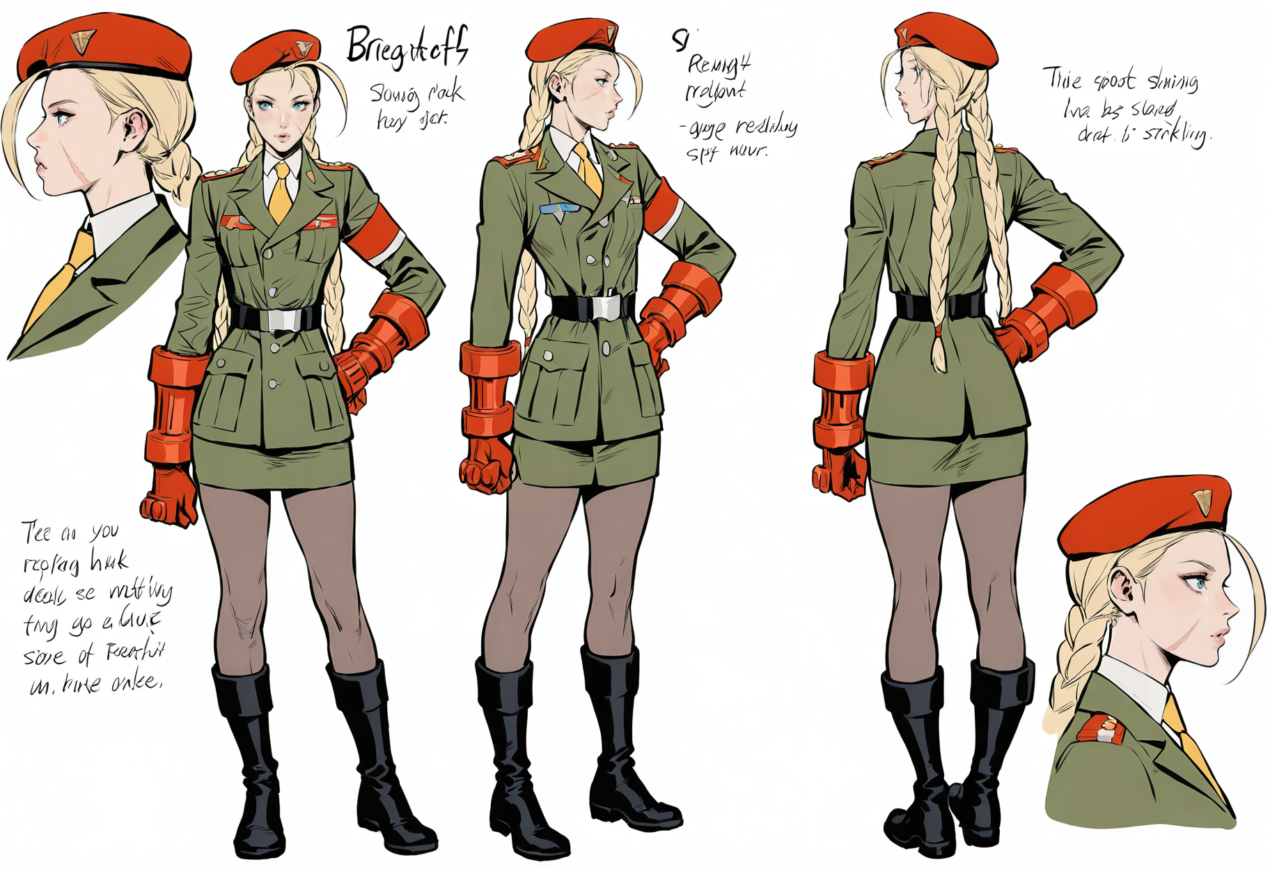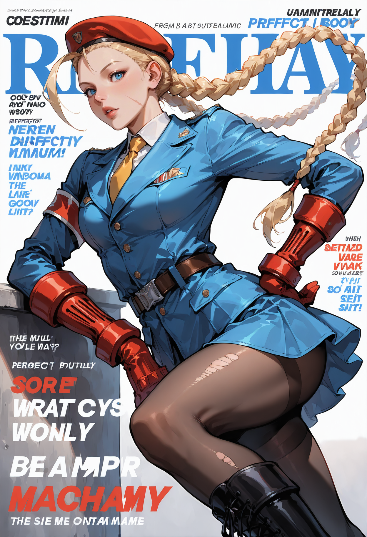 SF V ストーリーモード衣装: 1girl,hat,braid,boots,beret,blonde hair,uniform,blue eyes,long hair,hand on hip,twin braids,gloves,necktie,military uniform,alternate costume,military,skirt,lips,belt,garrison cap,scar,antenna hair,knee boots,yellow necktie,miniskirt,combat boots,ahoge,pantyhose