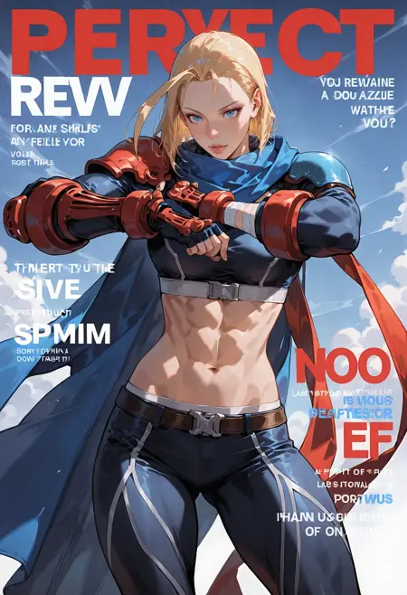 SF IV アルタネイティブ衣装: 1girl,midriff,blonde hair,boots,abs,hood,crop top,shoulder pads,bandages,armor,ahoge,scarf,huge ahoge,navel,pants,antenna hair,cape,belt,fingerless gloves,alternate costume,muscular,shoulder armor,pauldrons,gloves,blue eyes,toned