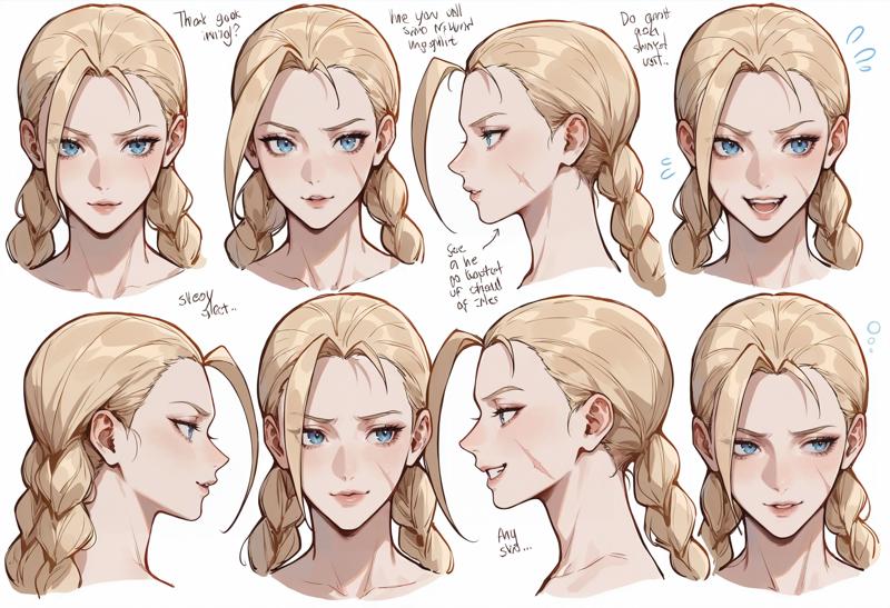 SF Alpha 衣装: 1girl,garrison cap,blue leotard,hat,blonde hair,leotard,gloves,blue eyes,fingerless gloves,ribbed leotard,boots,long hair,necktie,ahoge,braid,armband,twin braids,huge ahoge,scar,highleg leotard,antenna hair,highleg,thong leotard,knee boots,yellow necktie,shoulder pads,red gloves,breasts