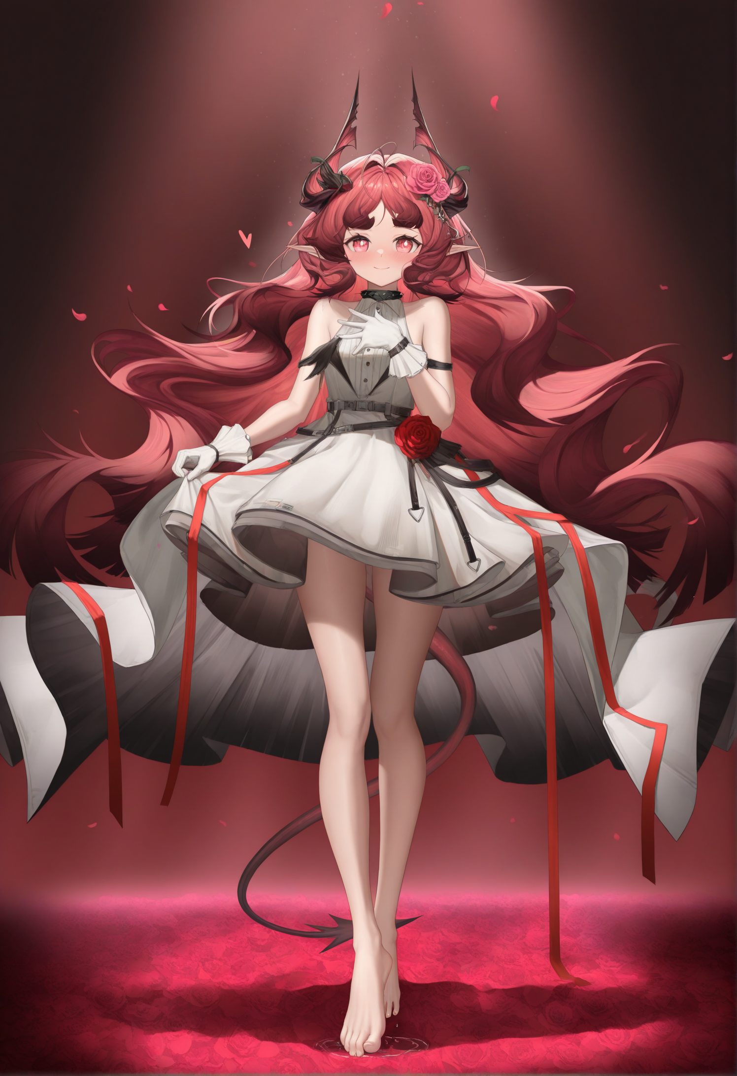 其他服装: 1girl (Arknights_Nymph, Arknights_Nymph alternate costume, Arknights_Nymph red eyes, Arknights_Nymph red hair, Arknights_Nymph horns, Arknights_Nymph pointy ears, Arknights_Nymph demon tail, long hair, blush, smile, bangs, hair ornament, red eyes, gloves, dress, very long hair, closed mouth, flower, heart, red hair, horns, sleeveless, pointy ears, white gloves, hair flower, white dress, symbol-shaped pupils, petals, sleeveless dress, rose, demon horns, pink flower, pink rose)