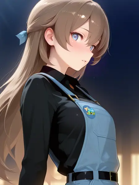 long sleeves,belt,blue overall, black collared shirt,brown gloves, badge on chest,knee pads, white sneakers
