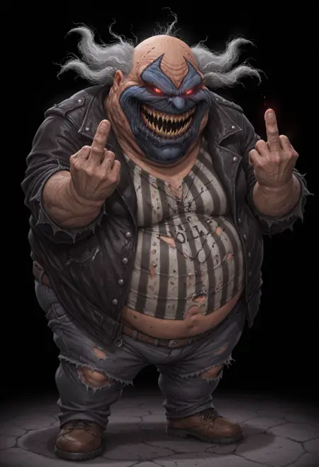 viocilf、赤い目、発光する目、灰色の髪、鋭い歯、縞模様のシャツ、ジャケット、太っている