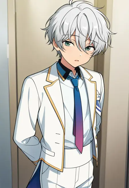 1boy, male focus, solo, green eyes, grey hair, white shirt, collared shirt, blue necktie, gradient necktie, white jacket, open jacket, tailcoat, white pants,