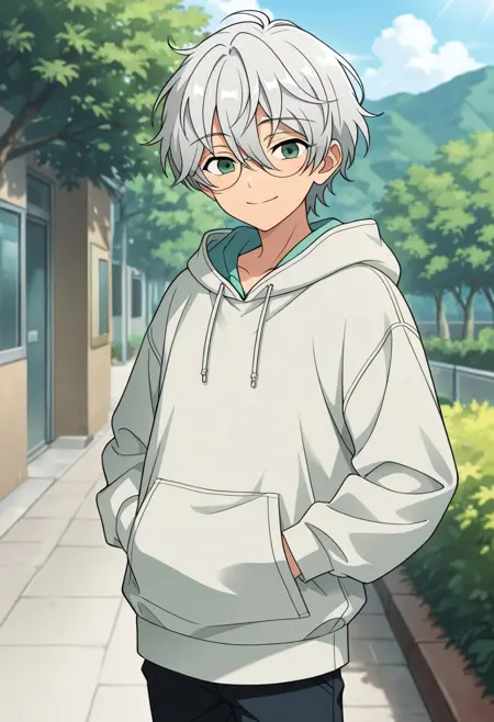 1boy, male focus, solo, green eyes, grey hair, glasses, collarbone, blue undershirt, white shirt, short sleeves, shirt tucked in, blue pants, sneakers, white footwear,