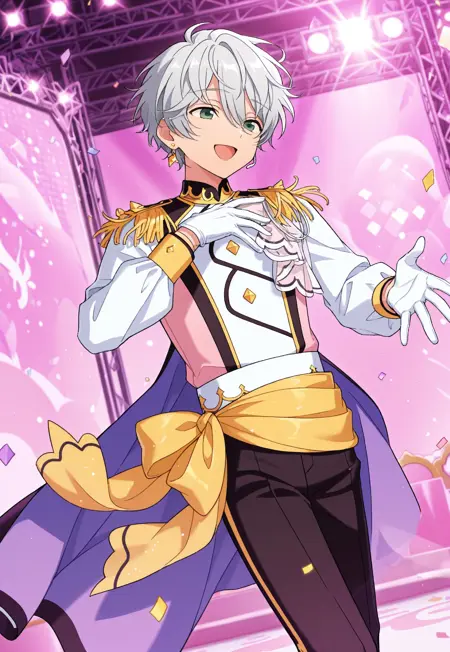 1boy, male focus, solo, green eyes, grey hair, NWD Outfit, earrings, white jacket, epaulettes, cape, gold trim, long sleeves, white gloves, waist sash, yellow sash, black pants, shoes, black footwear,
