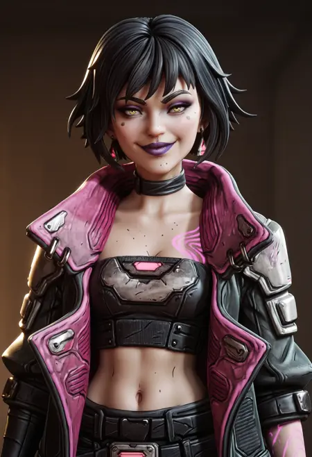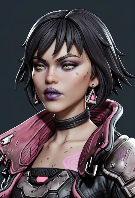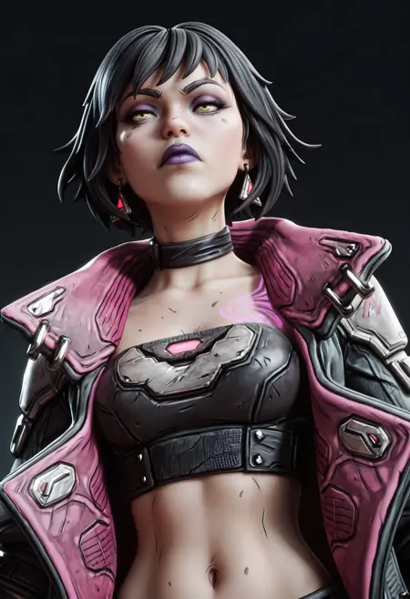 veilf, 外套, 短发, 黑发, 黄眼睛, 紫色嘴唇, 耳环, 项圈, 无指手套, 单条裤腿