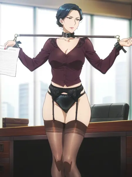 bondage spreader arms, Secretary1,white blouse, button up shirt,black skirt,satin panties, polka dot stockings, garter straps,black high heels,brunette hair, straight bangs, short bob haircut,pale skin, neutral makeup,red ball gag,wooden chair, hardwood floor, modern desk, bright interior, window light,