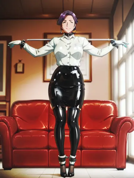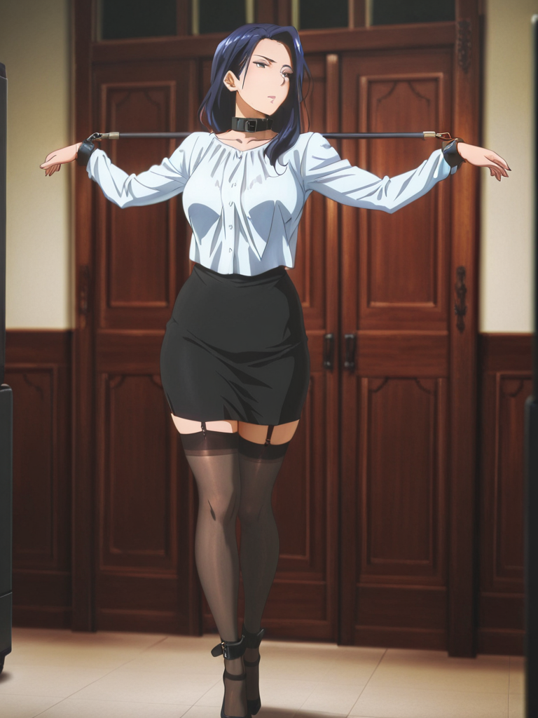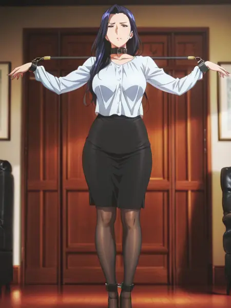 ボンデージスプレーダーアーム、秘書1、白いブラウス、ボタンアップシャツ、黒いスカート、サテンパンツ、ポルカドットストッキング、ガーターストラップ、黒いハイヒール、茶色の髪、ストレートの前髪、ショートボブ、薄い肌、ナチュラルメイク、赤いボールガグ、木製の椅子、硬木地板、モダンなデスク、明るい室内、窓からの光、